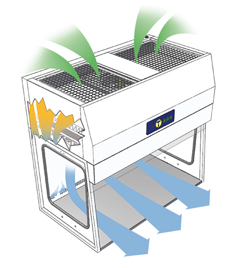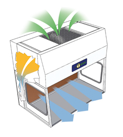 垂直凈化工作臺通常具有頂部或天花板安裝的過濾器。離開過濾介質(zhì)的空氣從設(shè)備頂棚單向流動(dòng),然后穿過工作表面,從而將顆粒從外殼中掃出。
